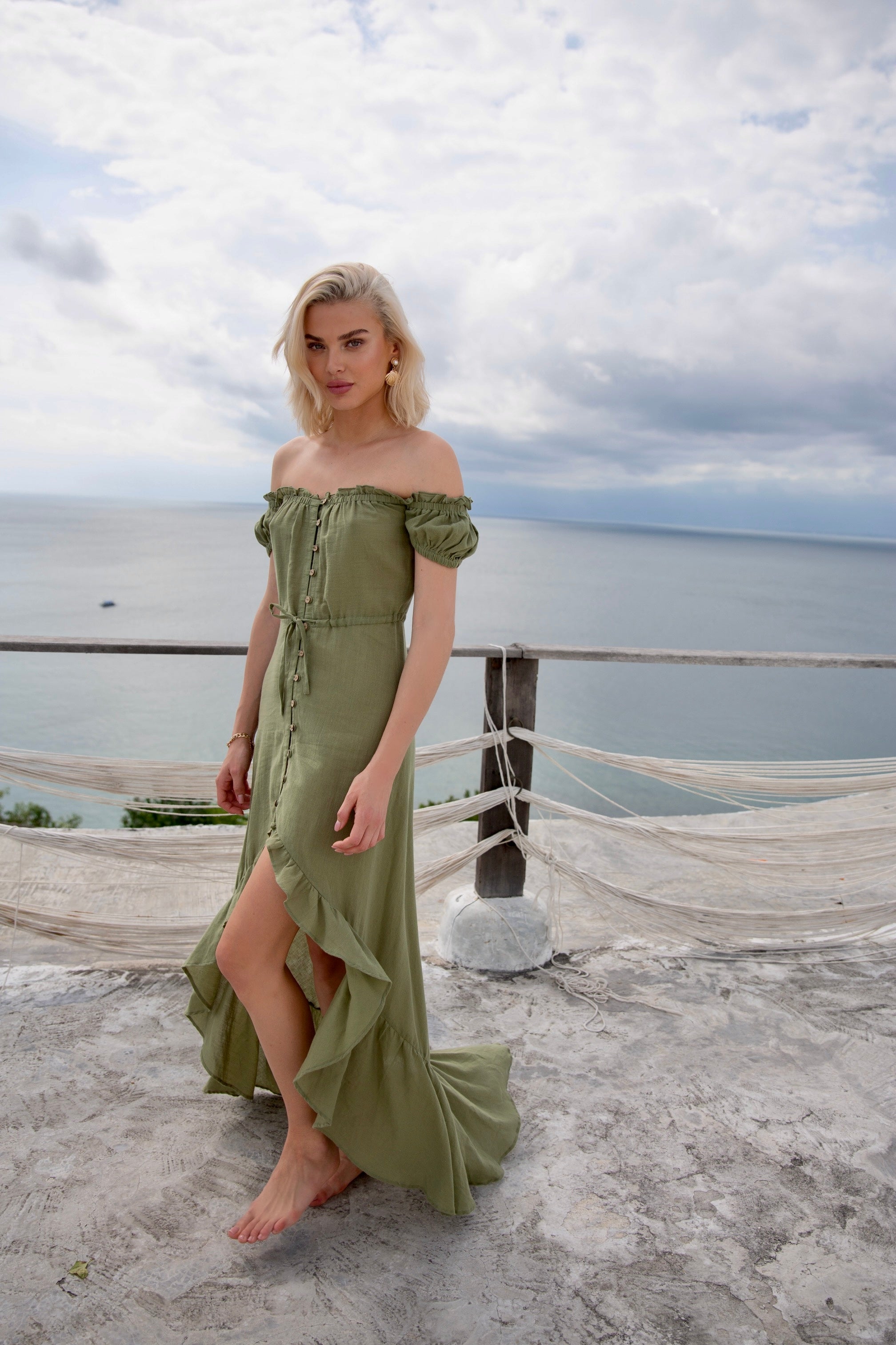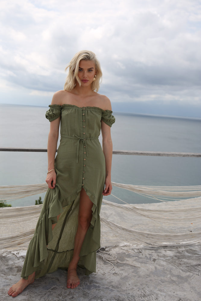 Make a statement with the Elia dress in a stunning olive color. Made from 100% organic cotton, this dress is both soft and breathable, making it perfect for any occasion. The regulated waist and buttoned front create a flattering silhouette, while the romantic and feminine design adds a touch of charm. Ideal for your next holiday or resort trip, the lightweight cotton dries fast and the more wrinkles it has, the better it looks. Simply pack it with your other Amanzula items and you're ready to go. Feel good about your eco-friendly choice with the Elia dress.